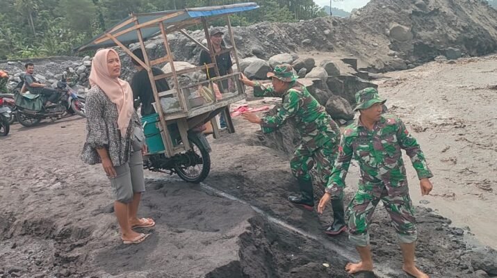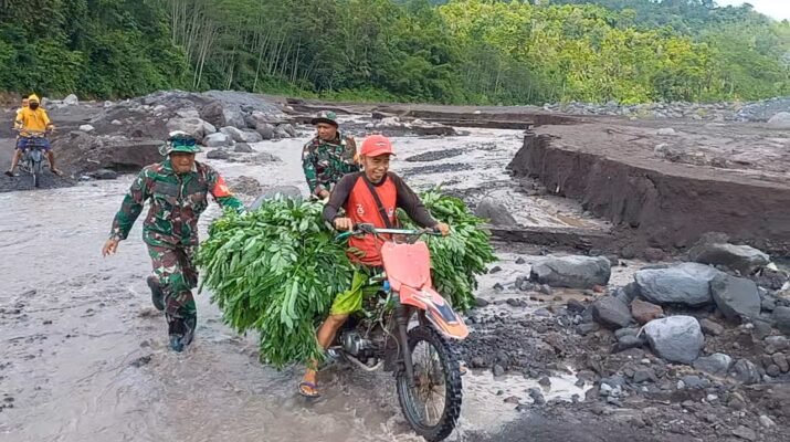 Lumajang – Di tengah cuaca yang tidak menentu dan aktivitas lahar dingin yang masih terjadi pasca-erupsi Gunung Semeru, Personel TNI kembali menunjukkan komitmen