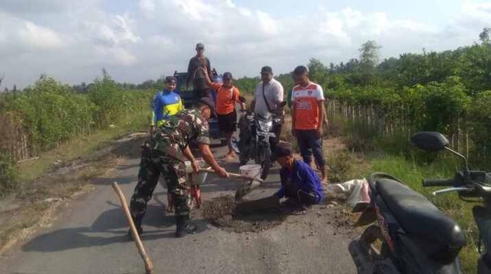 Babinsa Sidorejo Ajak Warga Gotong Royong Perbaiki Jalan Aspal Berlubang