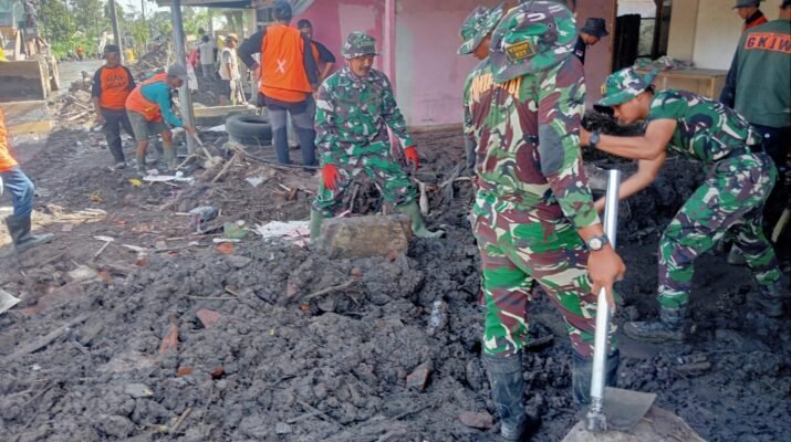 Lumajang — Upaya percepatan penanganan pascaerupsi Gunung Semeru terus dilakukan oleh personel gabungan dari Kodim 0821/Lumajang, Yonif 527/BY, BPBD, serta relawan.